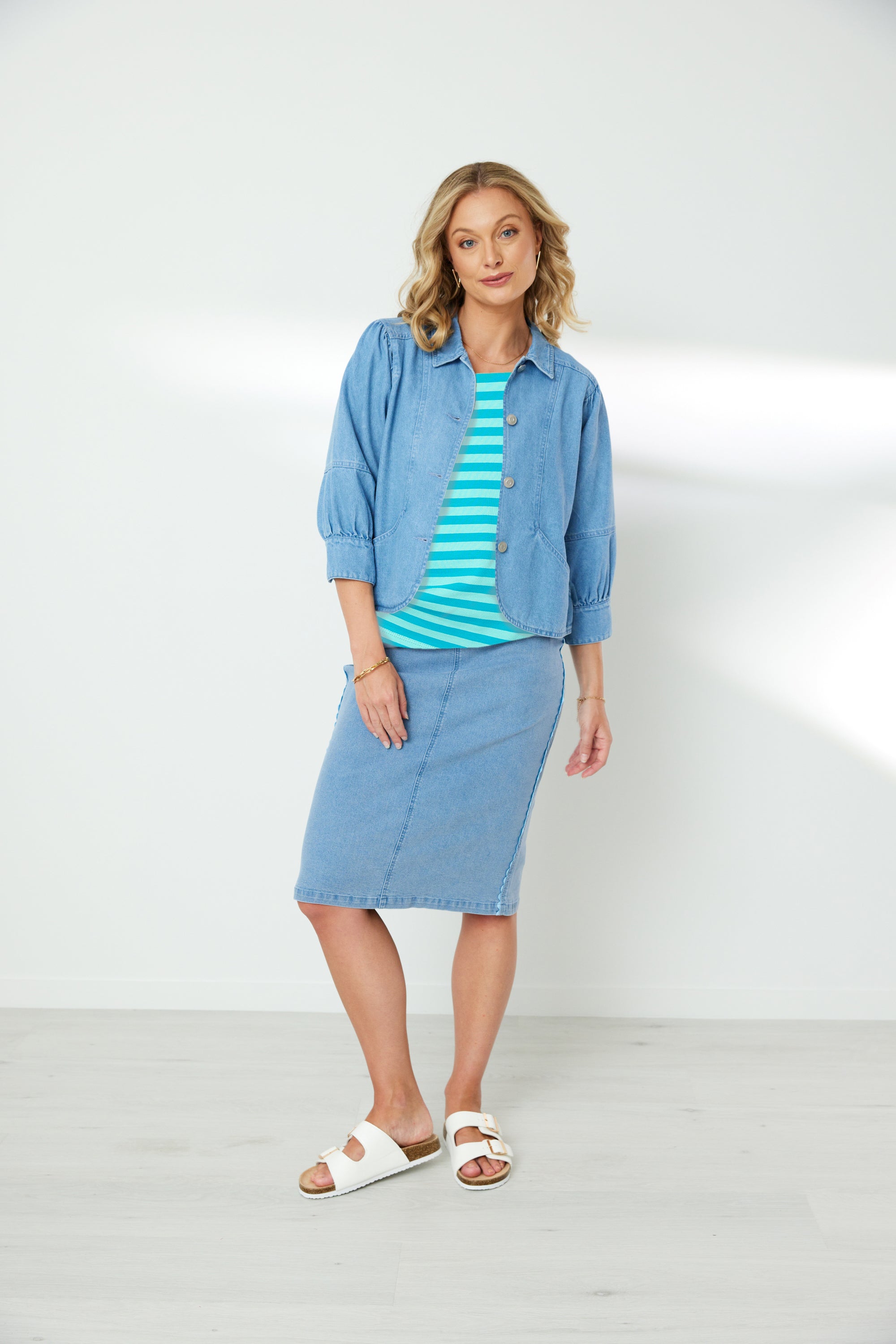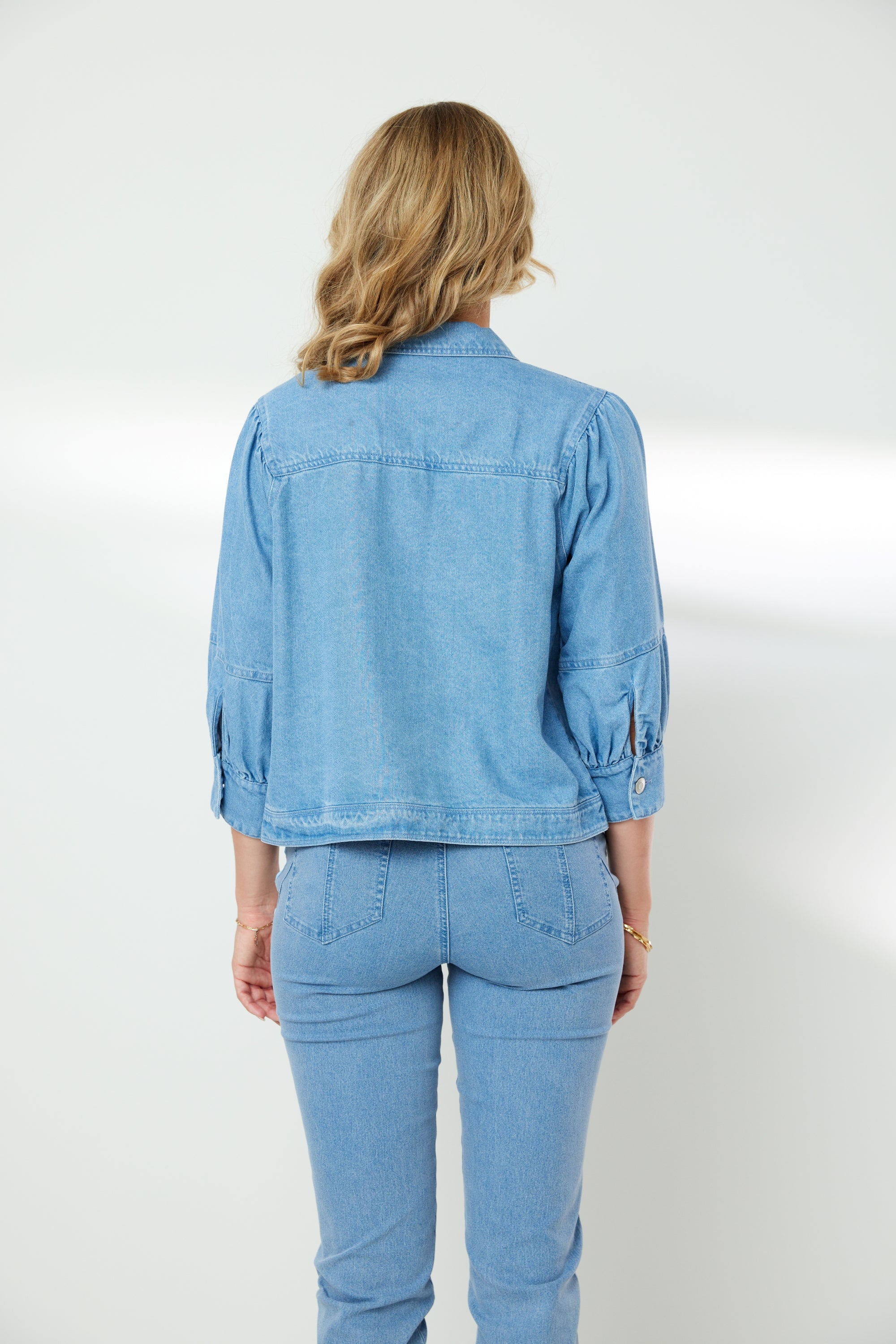 Button front with collar. Curved hem. 3/4 length sleeves with wide button cuff. Front inseam pockets. Back yoke."