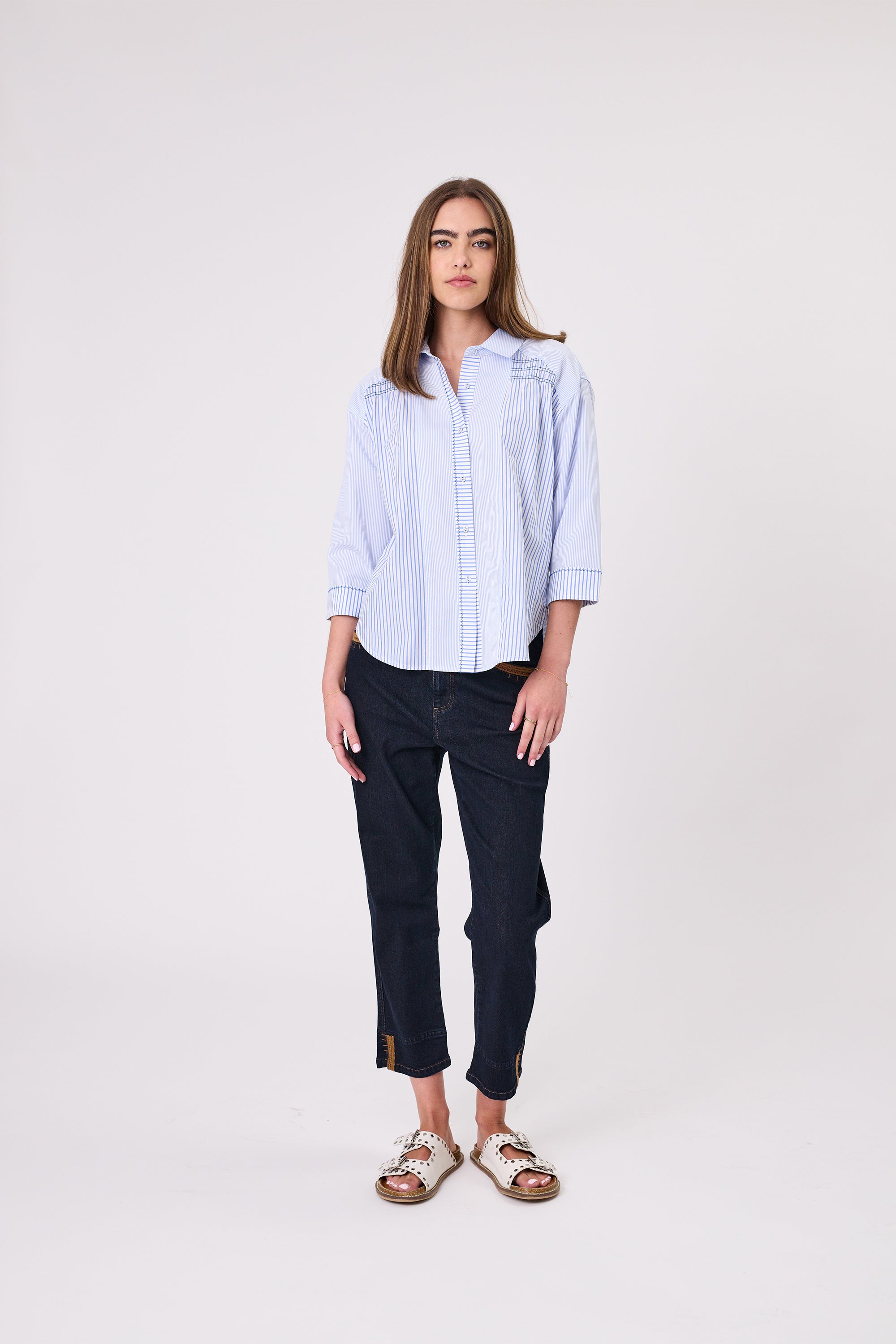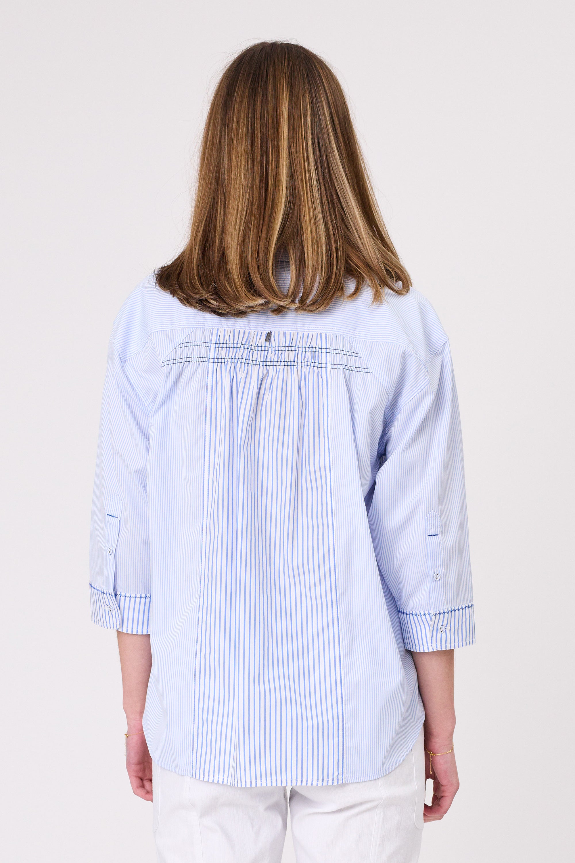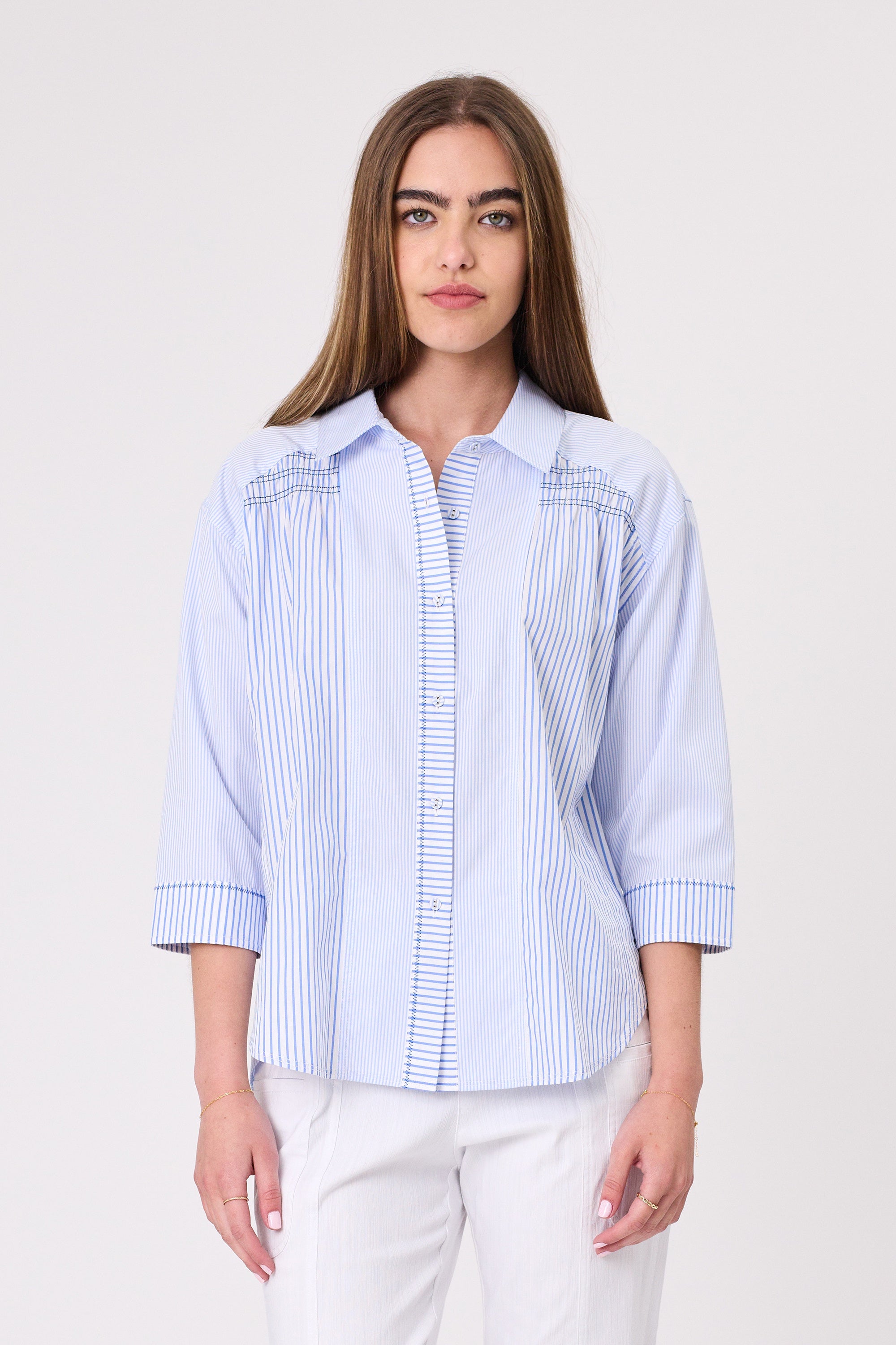 Thin and wide stripes design button up shirt with collar. Dropped shoulder with mid sleeves length. Shirred details at front and back. Contrast zigzag stitching at placket and cuffs. It has side splits and self fabric covered button at front placket and sleeves.