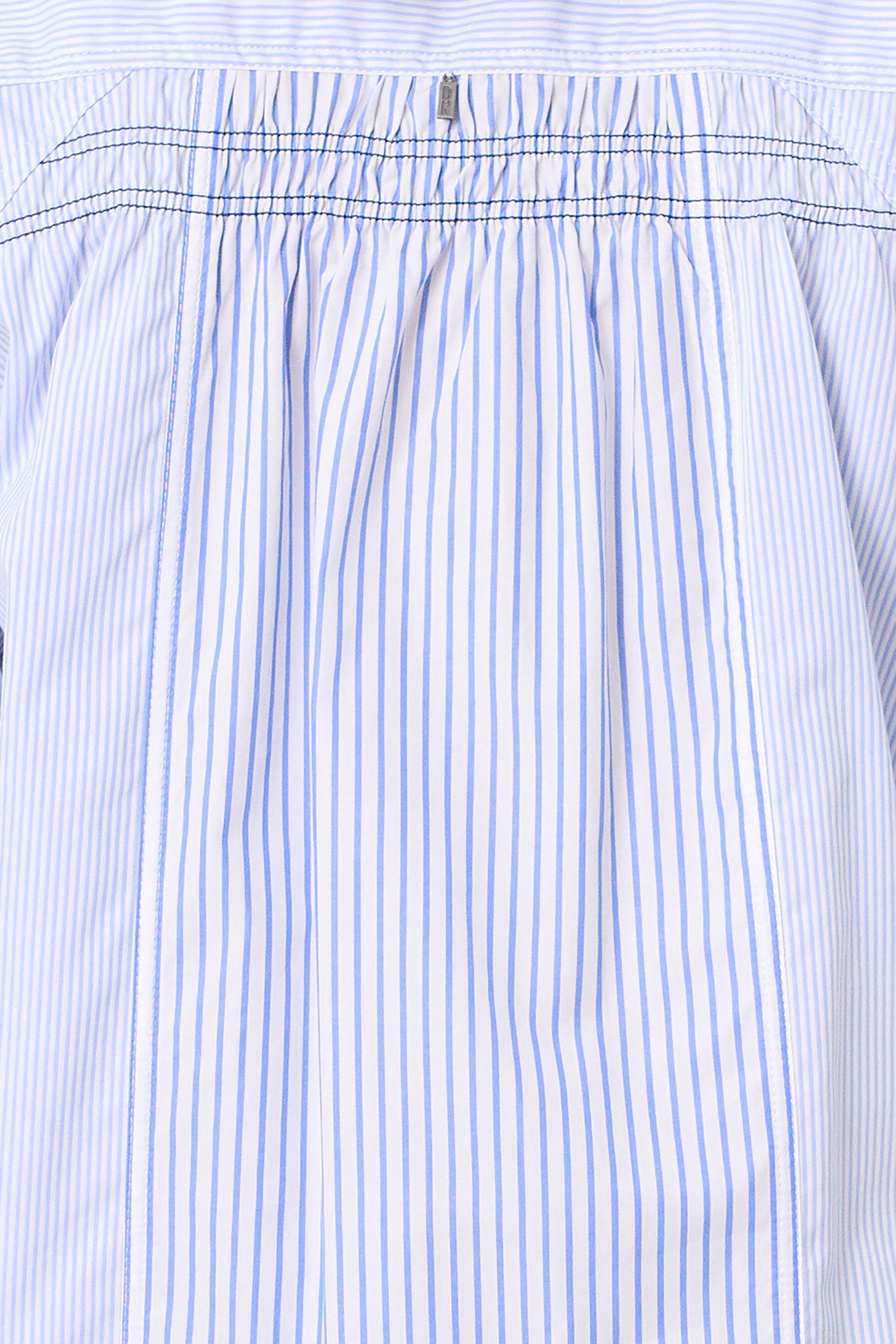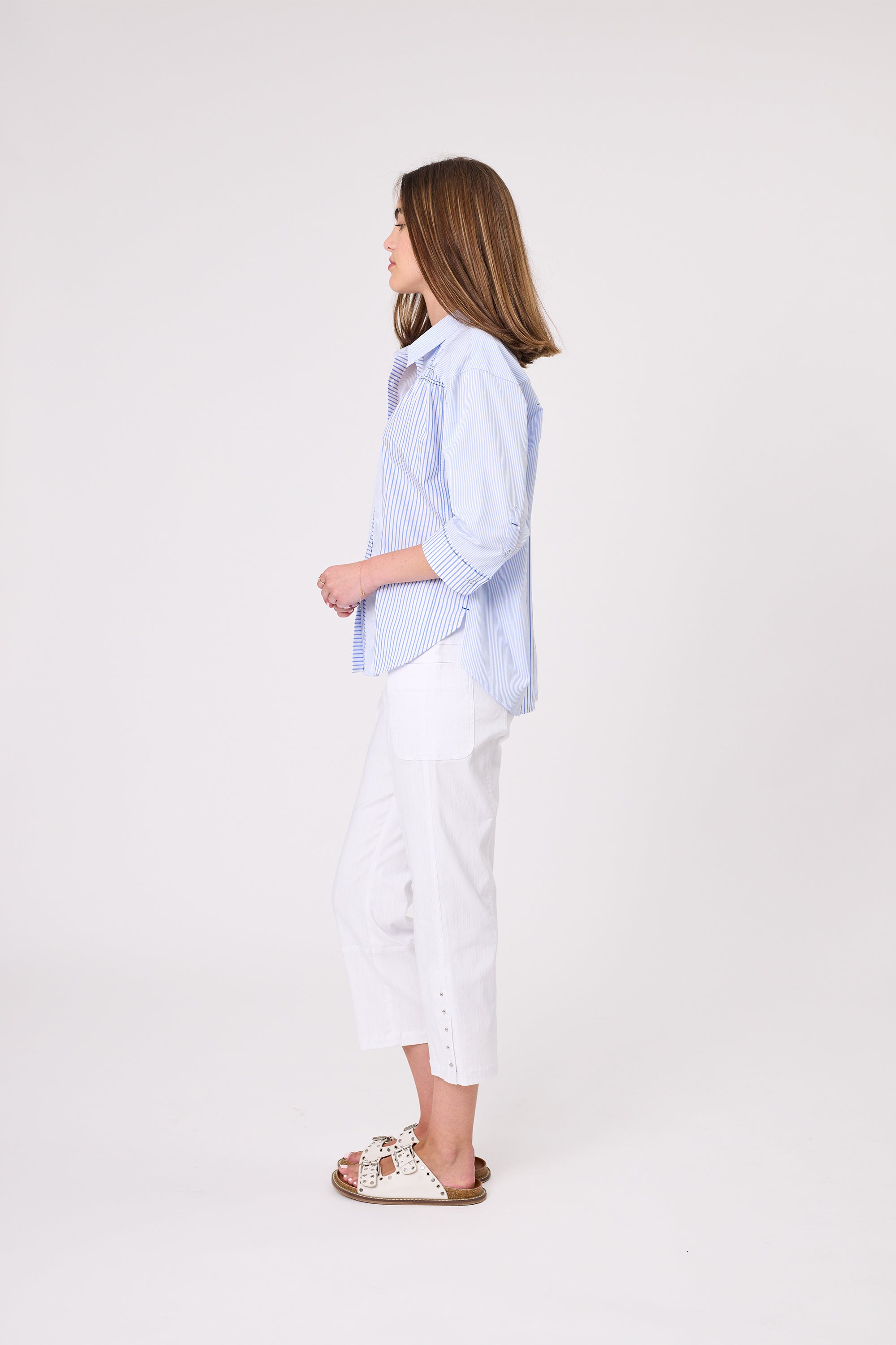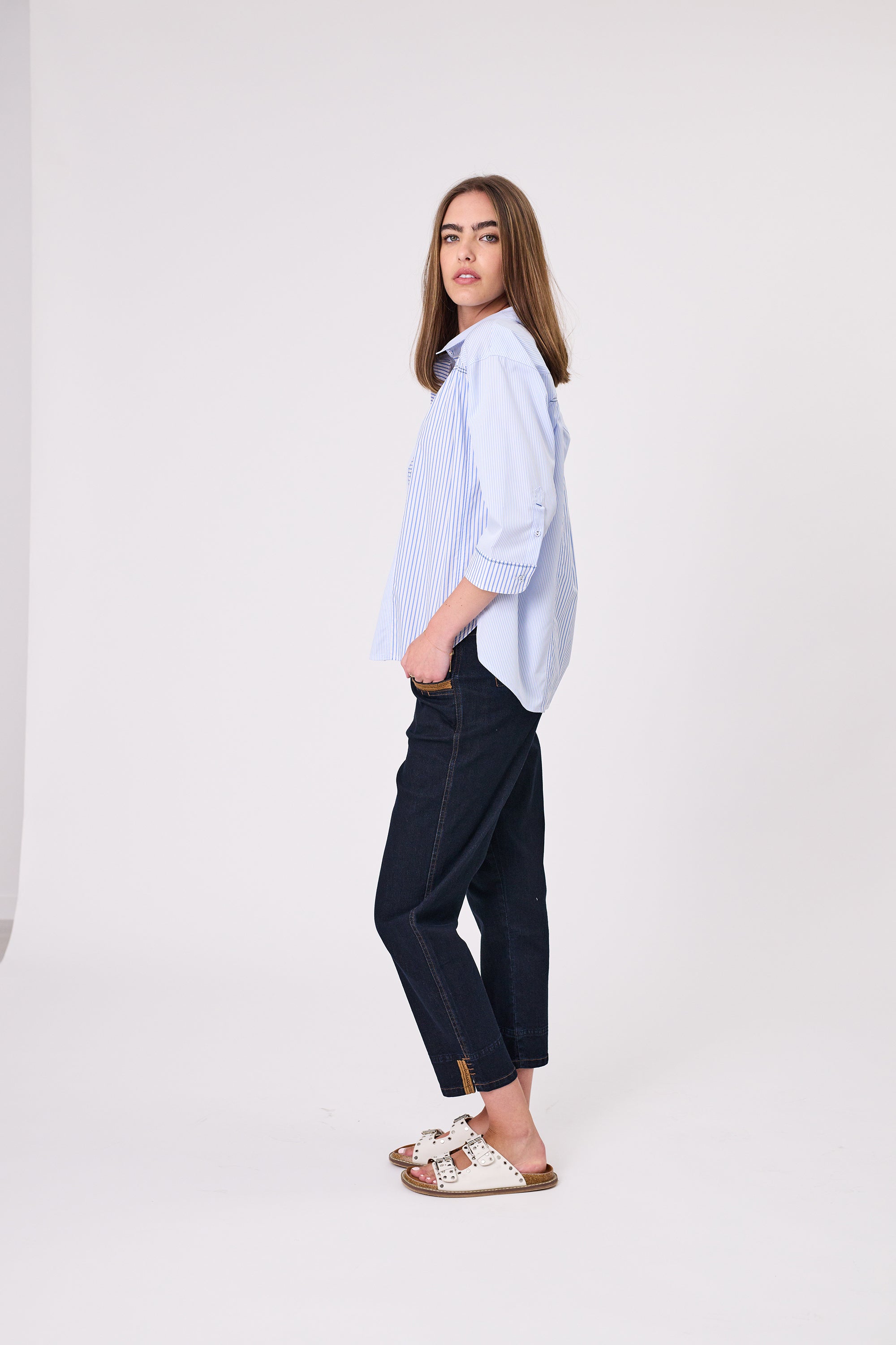 Thin and wide stripes design button up shirt with collar. Dropped shoulder with mid sleeves length. Shirred details at front and back. Contrast zigzag stitching at placket and cuffs. It has side splits and self fabric covered button at front placket and sleeves.