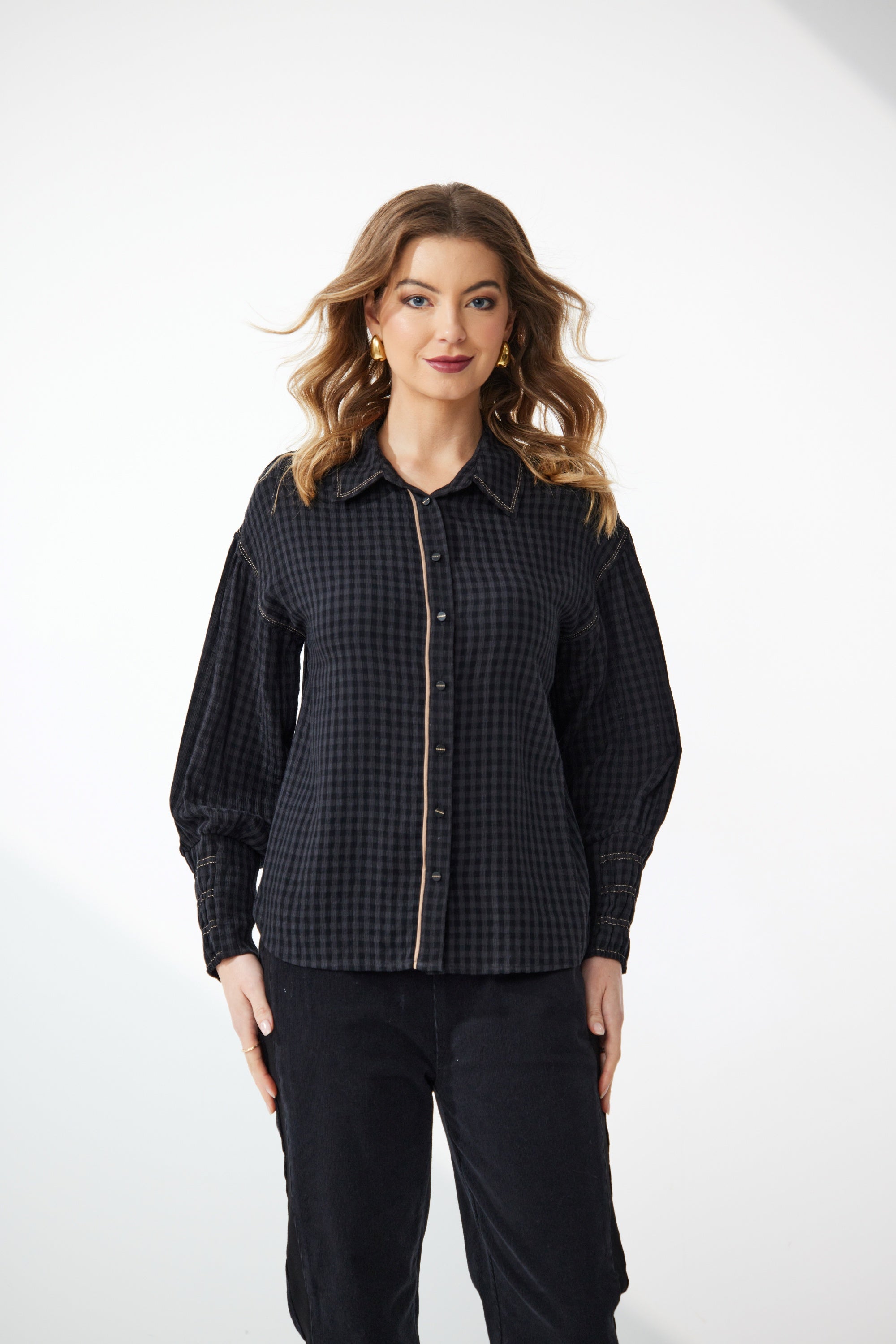The classic shirt look with a twist! Dropped shoulder with deep elasticated cuffs. Button front with contrast piping at placket. Contrast stitching at seams.
