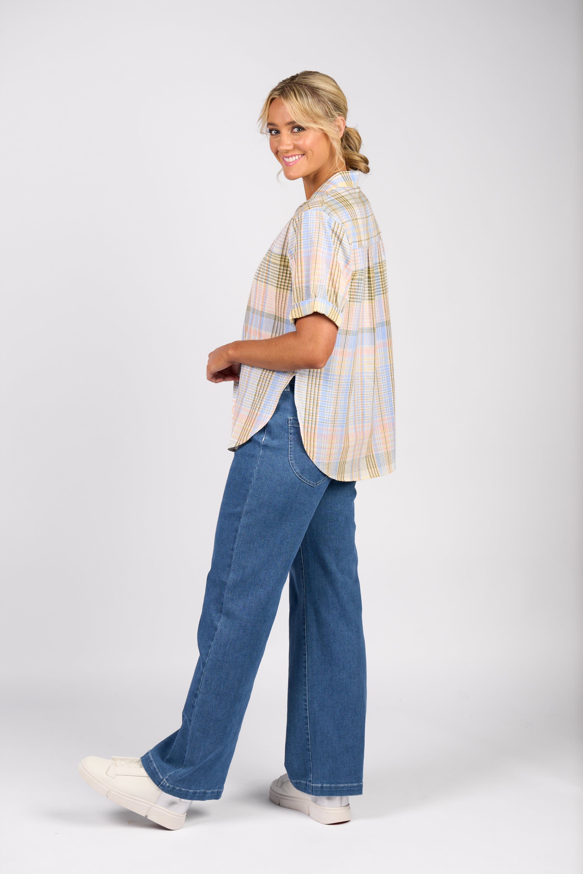 This short-sleeve collared checkered shirt is made from 100% cotton. It features turned-up sleeve cuffs, a dropped shoulder and curved hems with side splits for a relaxed, easy-going look.