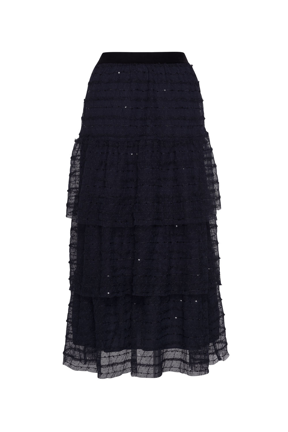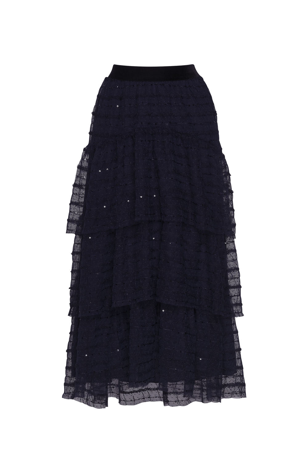 Tulle skirt with layered tiers, featuring sequin highlights, and a velvet elastic waist band. Fully lined