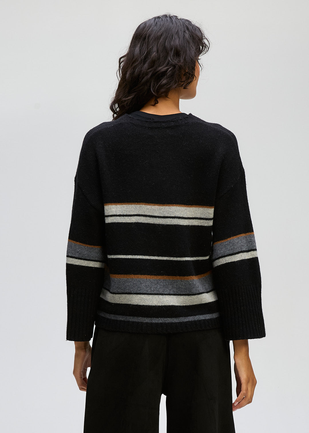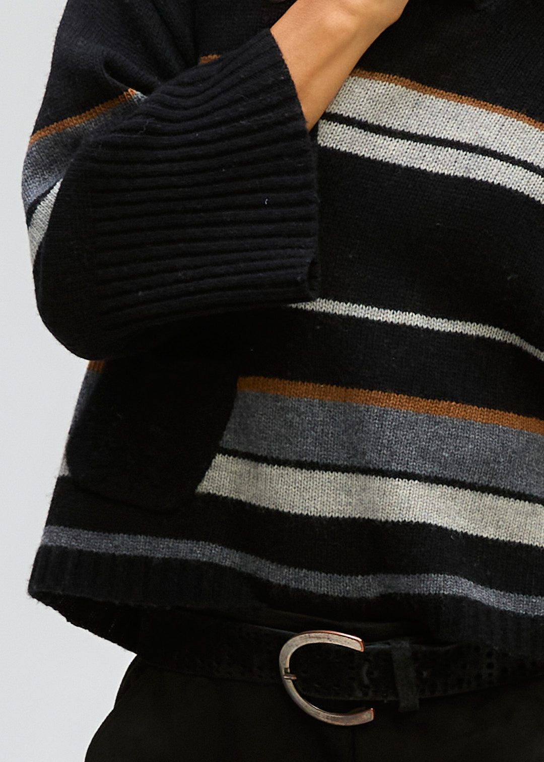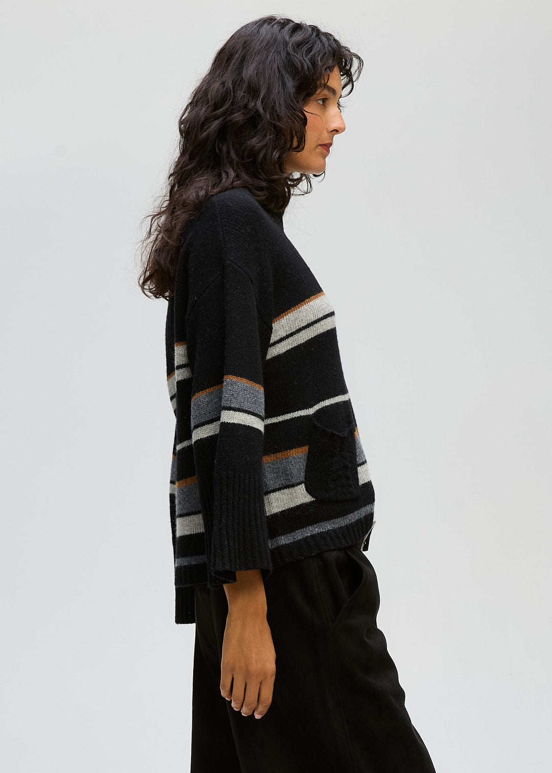 CROP STYLE JUMPER , Drop shoulder . Varigated stripe , wide sleeve. Deep ribbed cuffs . Just the one pocket with a cable stripe down the middle and the most flattering neckline . Front and Back the same stripes .