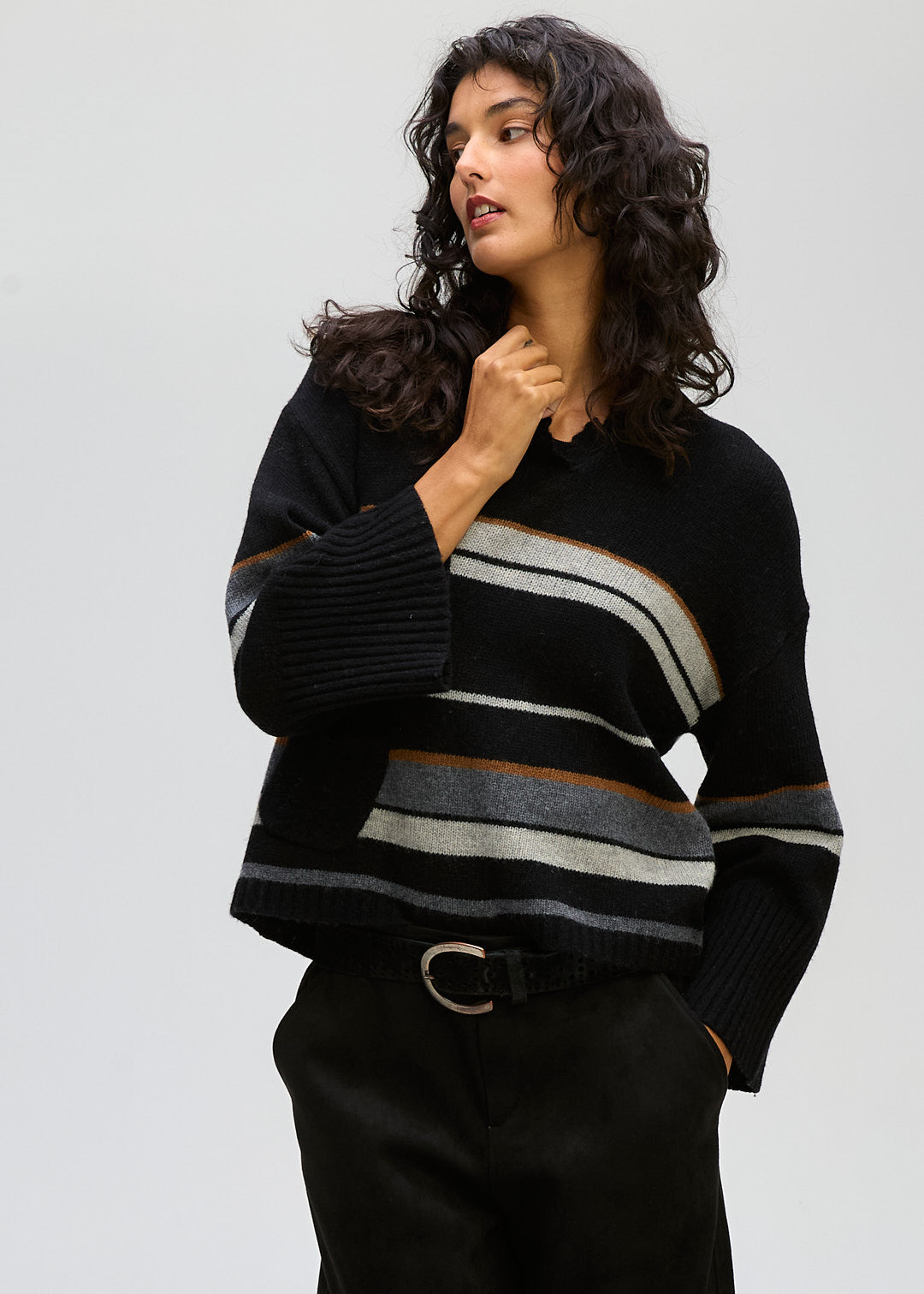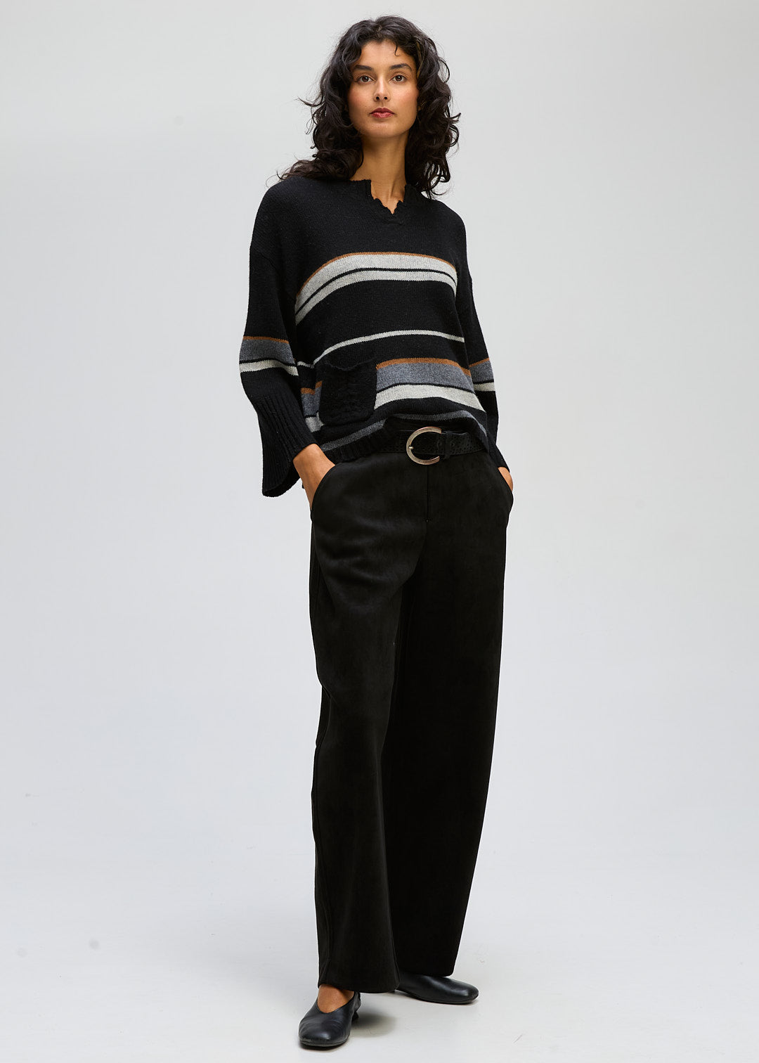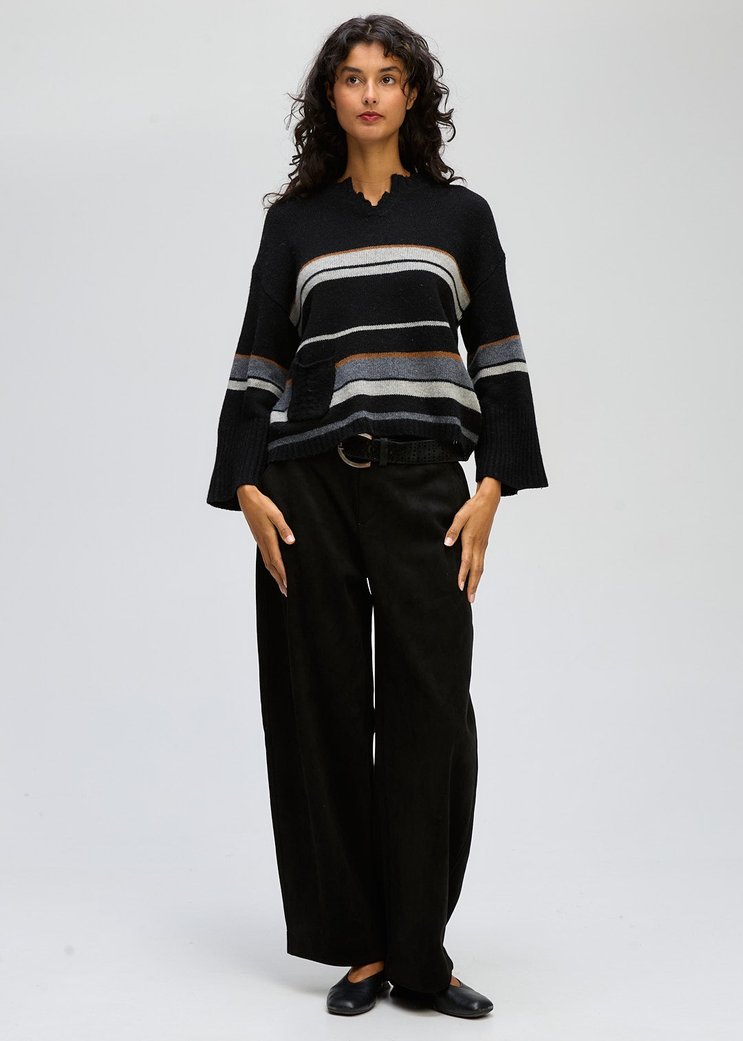 CROP STYLE JUMPER , Drop shoulder . Varigated stripe , wide sleeve. Deep ribbed cuffs . Just the one pocket with a cable stripe down the middle and the most flattering neckline . Front and Back the same stripes .