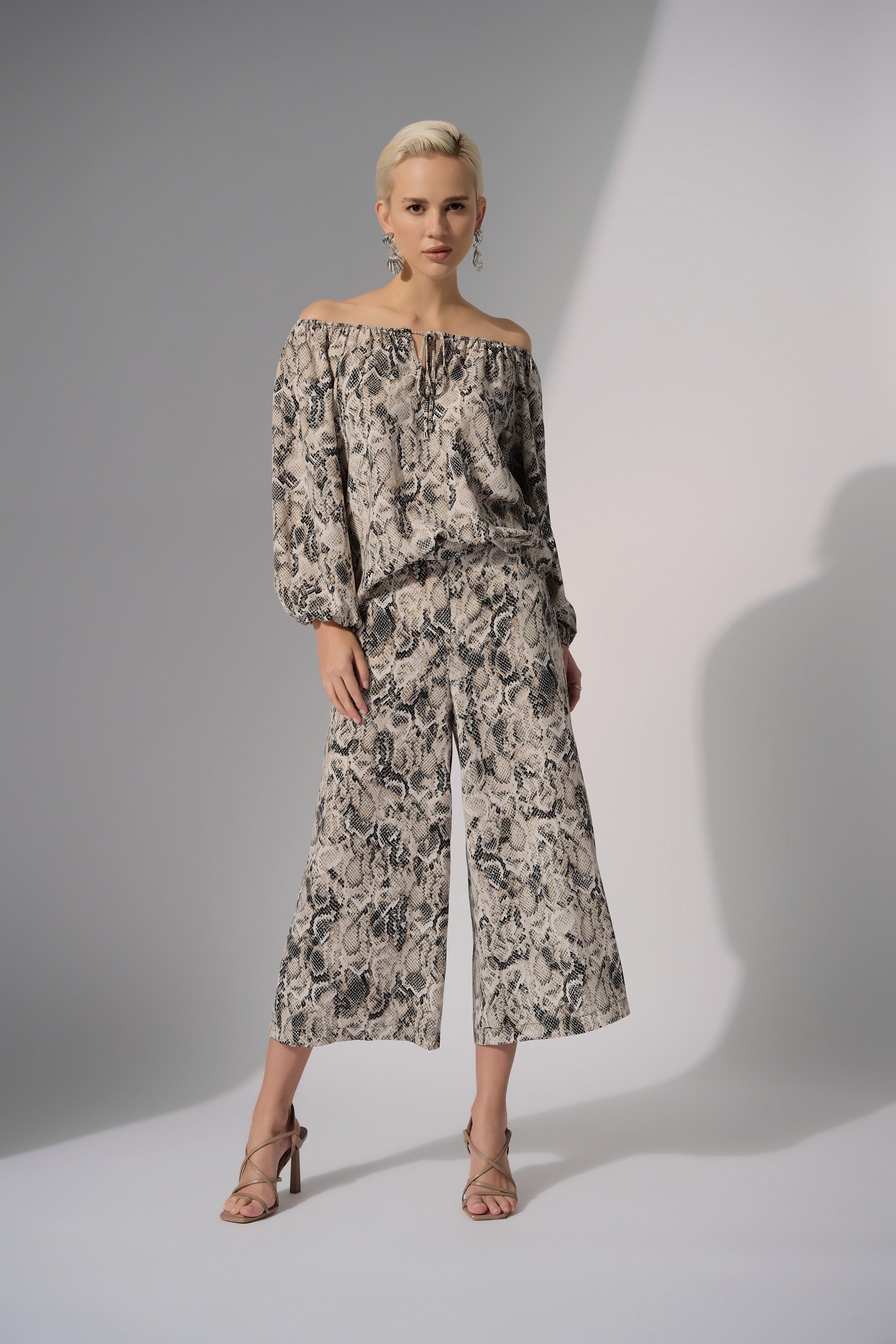 This flared top, featuring a modern python print, adds a bold edge to your wardrobe. Crafted from airy woven gauze, it offers stylish comfort with an open neckline, highlighted by a front keyhole and drawstring. Roomy puff sleeves create a relaxed, flattering silhouette. Paired with black straight leg pants, this top makes a striking statement all on its own.