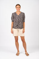 Soul - The Fizz Top in Soul print is made from a lightweight rayon-nylon blend that drapes beautifully. It has a V-neckline, gathered centre front seam, and puff sleeves with pleated cuffs for a delicate, feminine feel. Side seam splits and a relaxed fit complete the easy-going yet polished look.