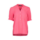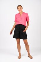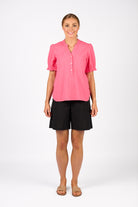 The Naomi Top is a relaxed summer favourite made from lightweight cotton with a linen look. It features short puffed sleeves with shirring at the cuffs, a V-neck with a flat mandarin collar, and a button-up chest. The softly rounded hem dips lower at the back for easy, laid-back style.