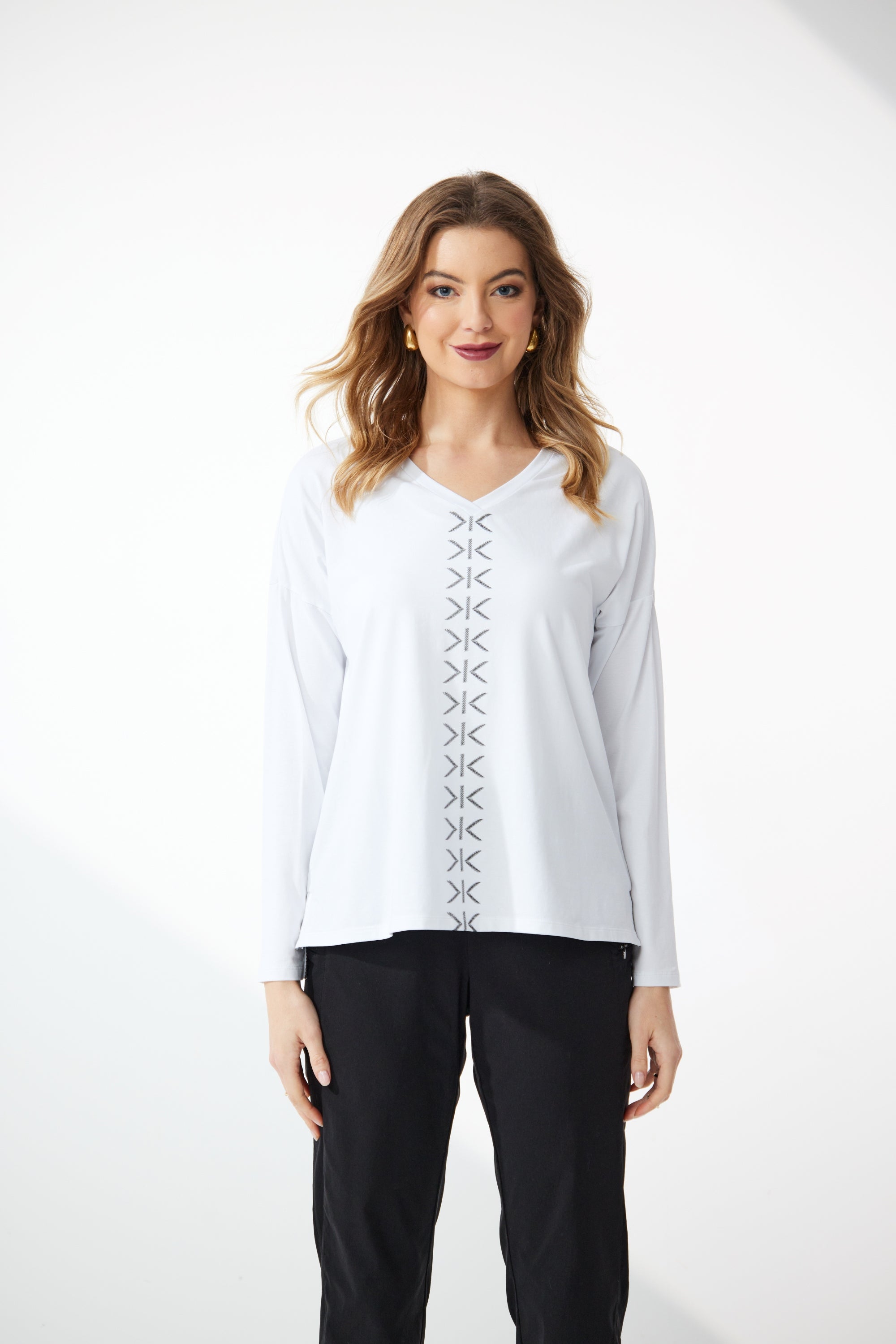 Look to the Domino Casual Tee for an on-trend, yet relaxed look. The V neck and dropped shoulder design give it a casual feel, while the long sleeves make a great layering piece. The side splits add a touch of uniqueness to the top, and the print design at the front chest adds a pop of detail.