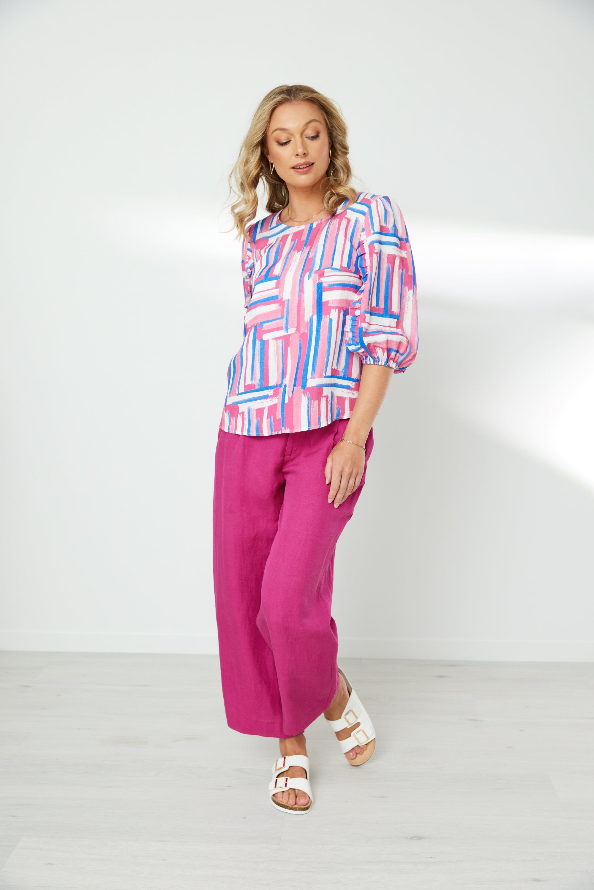 Fresh summer printed top with scoop neck & keyhole detail at back neck. Mid length sleeves with frill at front and back of sleeve. Elasticated cuffs.