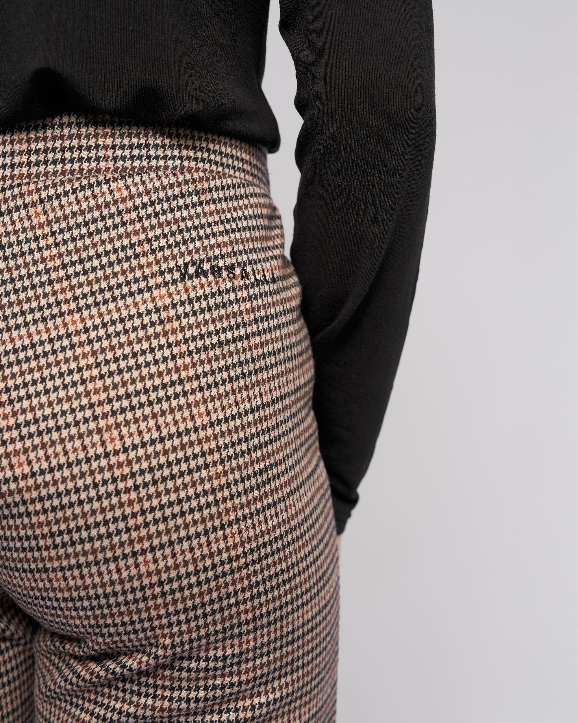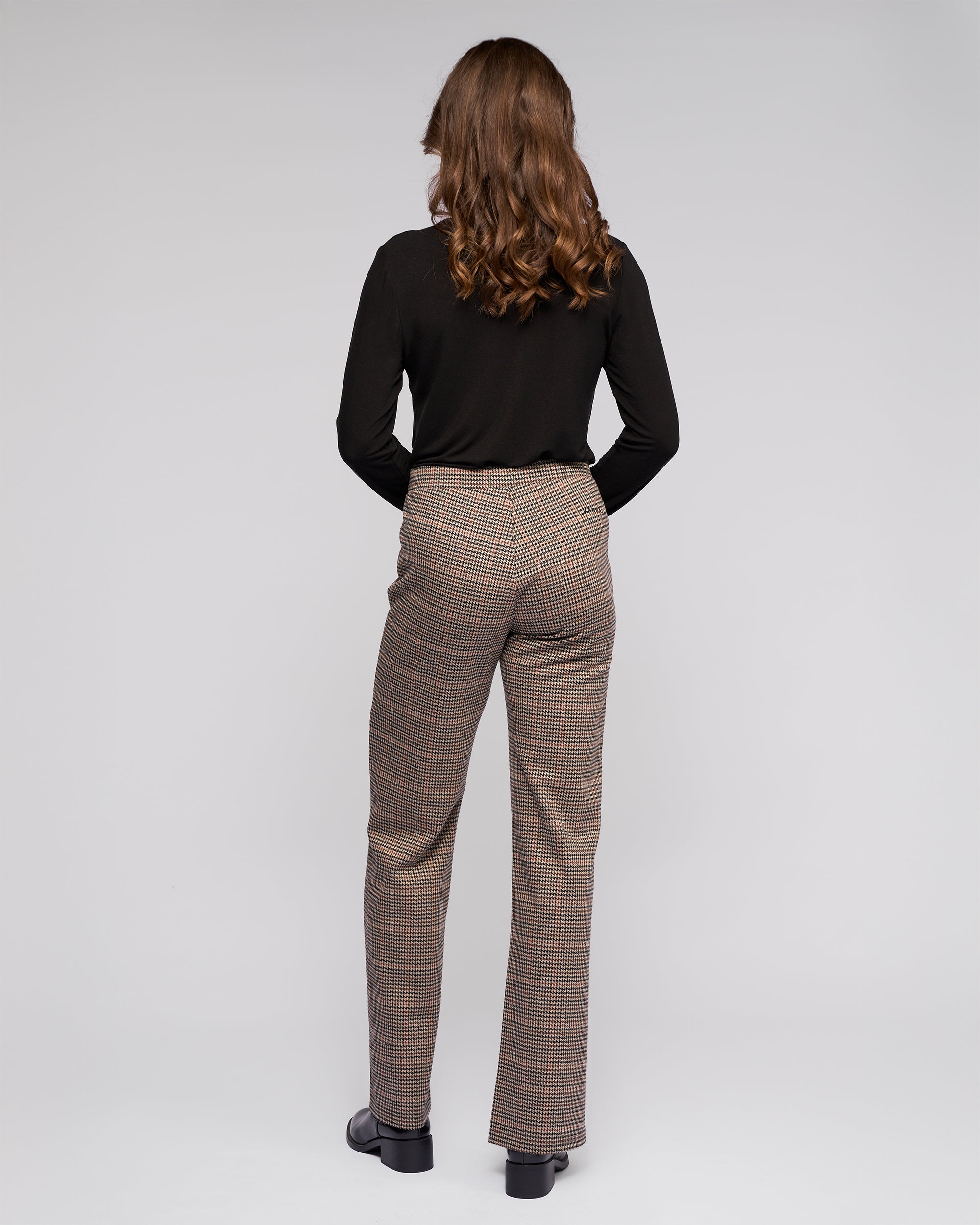 Full-length straight-leg pant in a soft knit fabric, designed in our Ezra print — an oat base with black and brown check and fine copper and forest green accents. The pull-on design with an elastic waistband offers everyday comfort, and the pant is finished with Vassalli logo embroidery at the back.