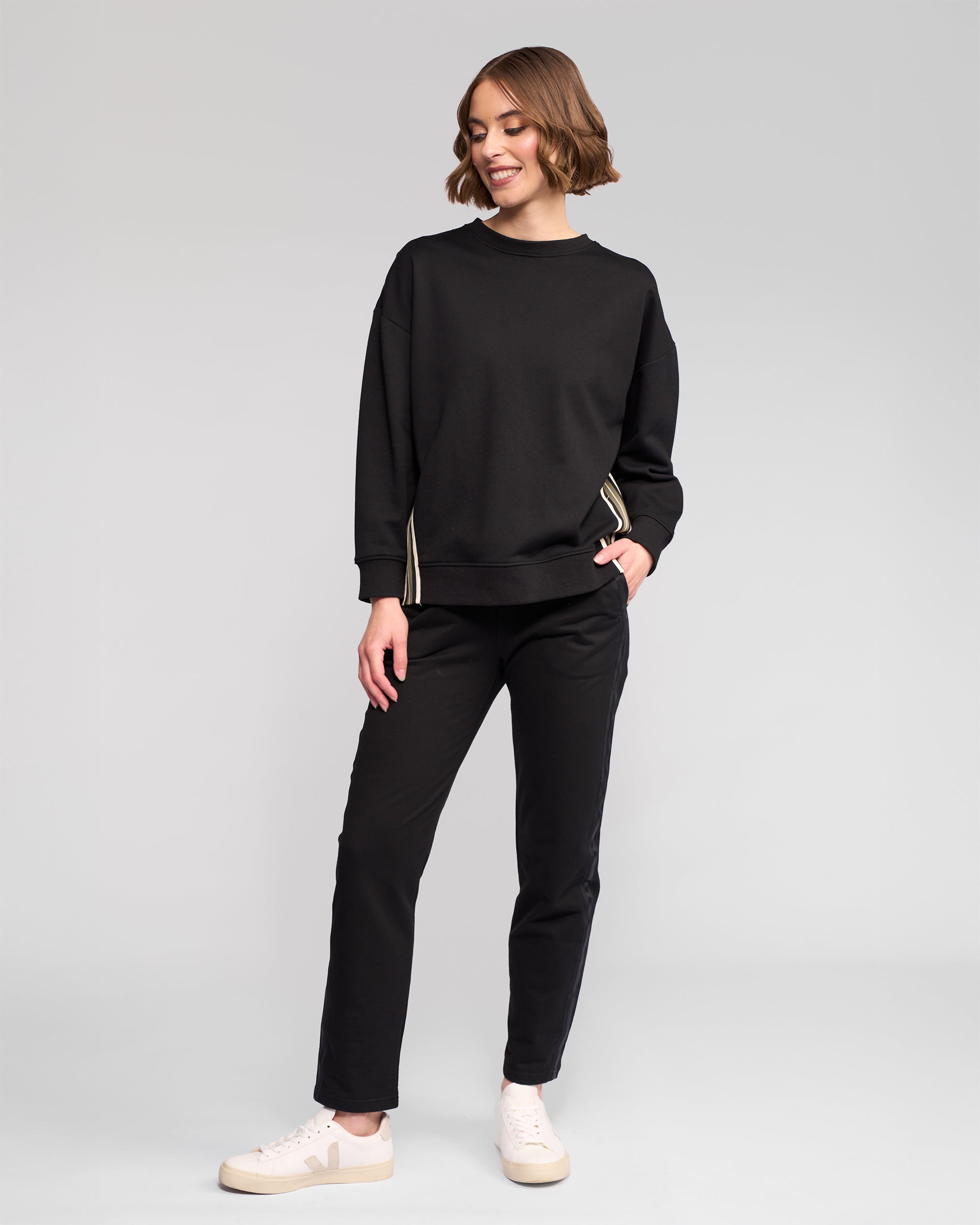 Casual crew neck sweater in black, made from 100% cotton for comfortable everyday wear. Designed with a relaxed fit and drop-shoulder sleeves, this style features contrast white and tan stripes down the sides for a sporty finish.