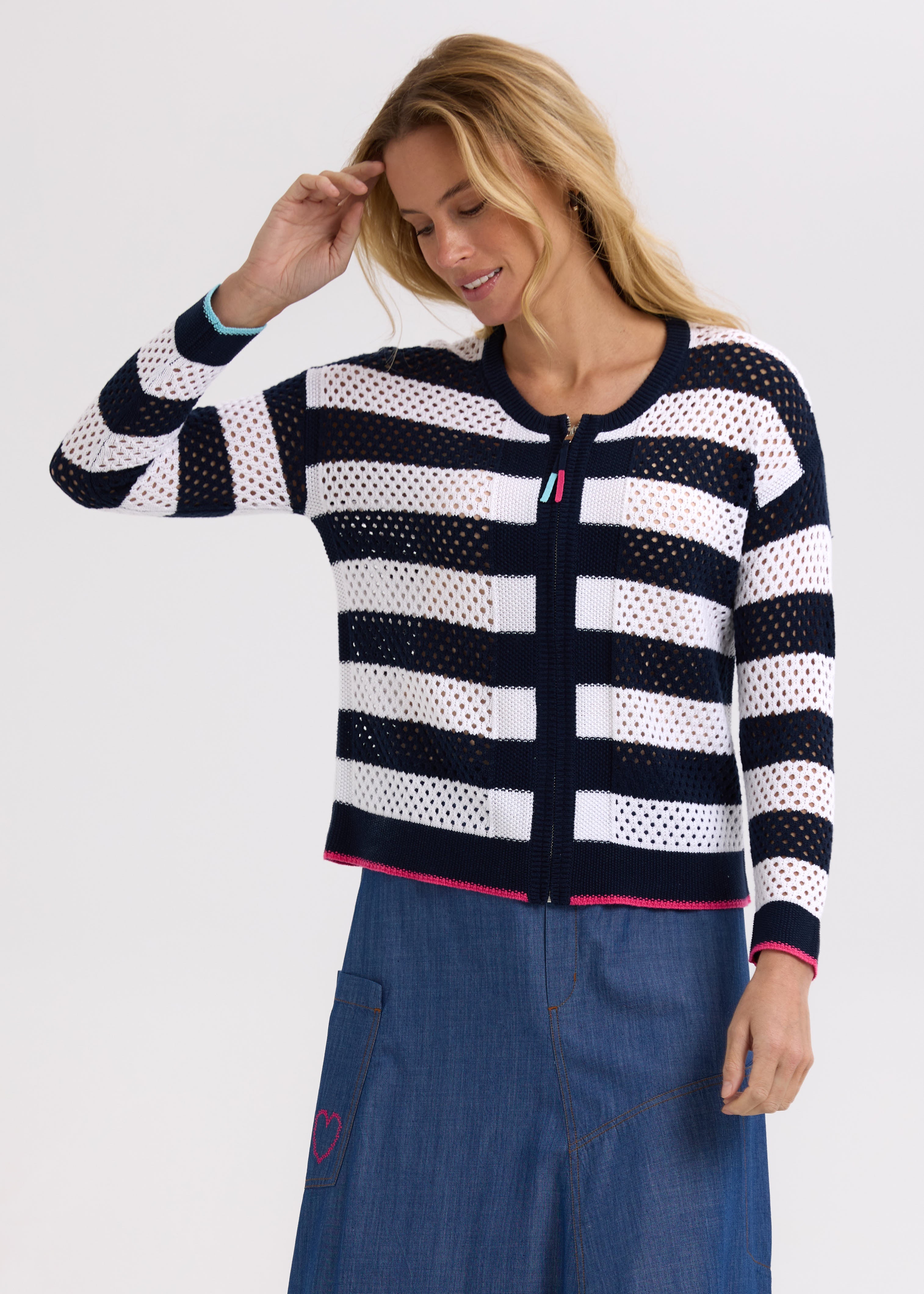 Drop shoulder , Striped Zip front cardi in Pointelle ( small holes ) Contrast colors on zip tags to match contrast cuffs and hemline . Basket weave stitch acts as a stripe within the stipe around the sleeve and sides of the garment.