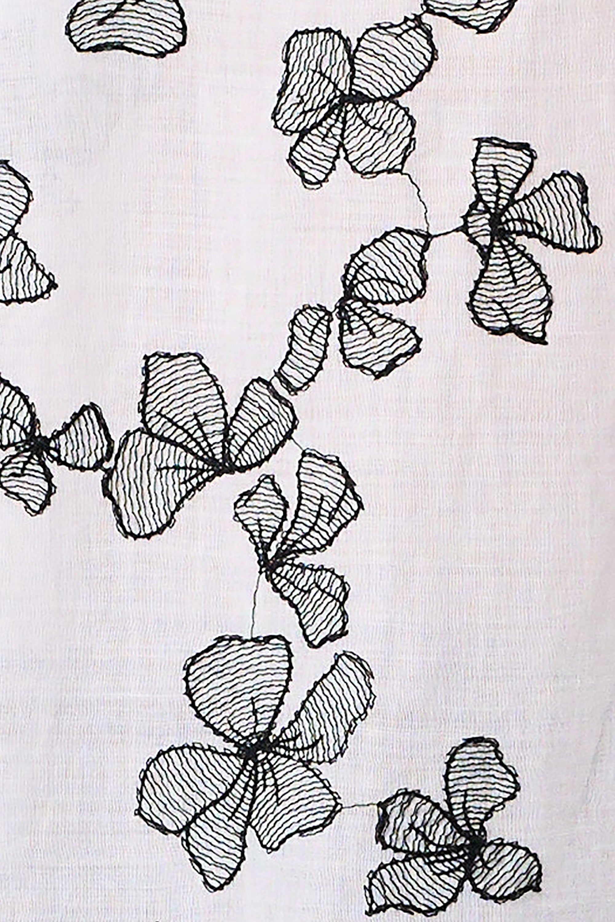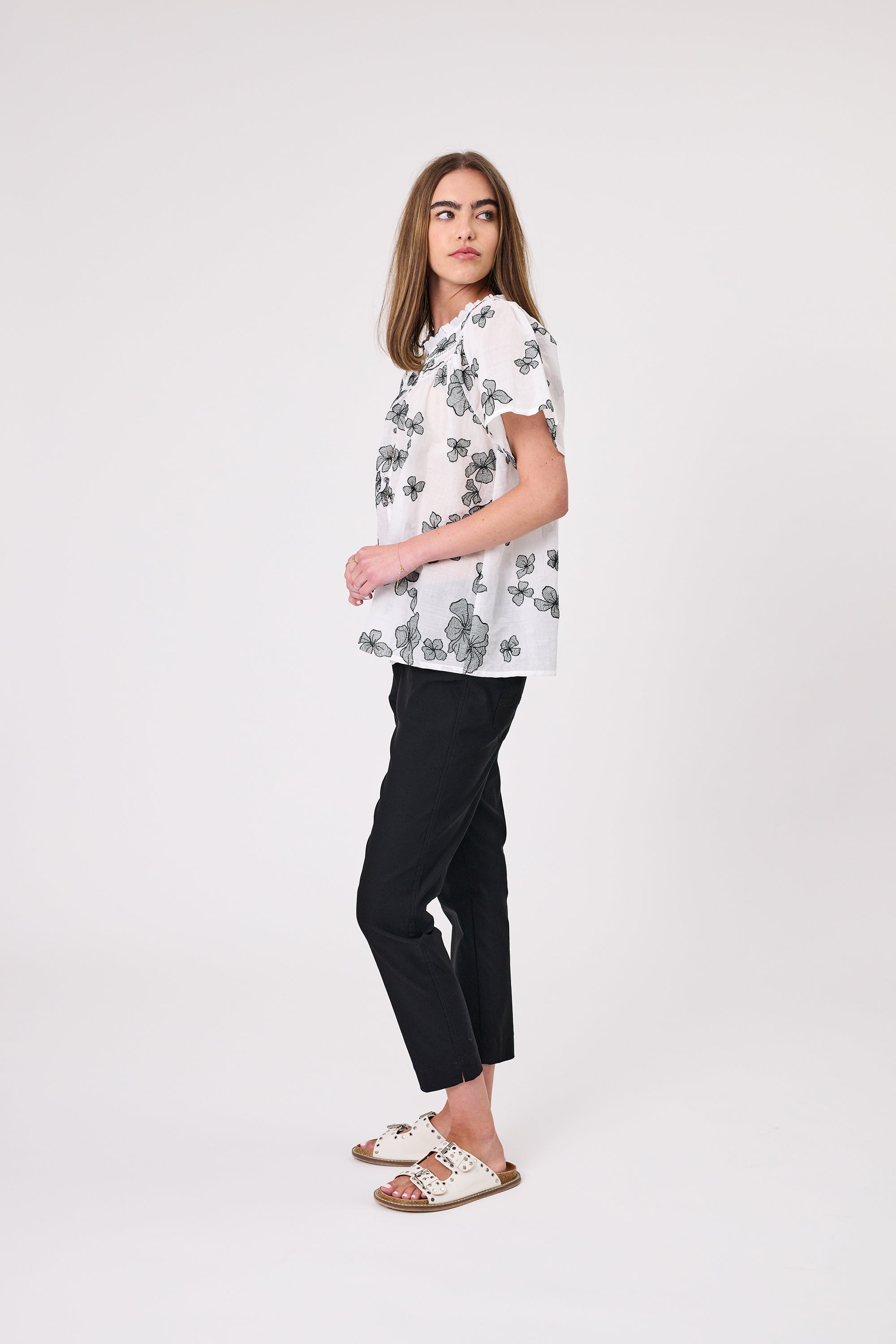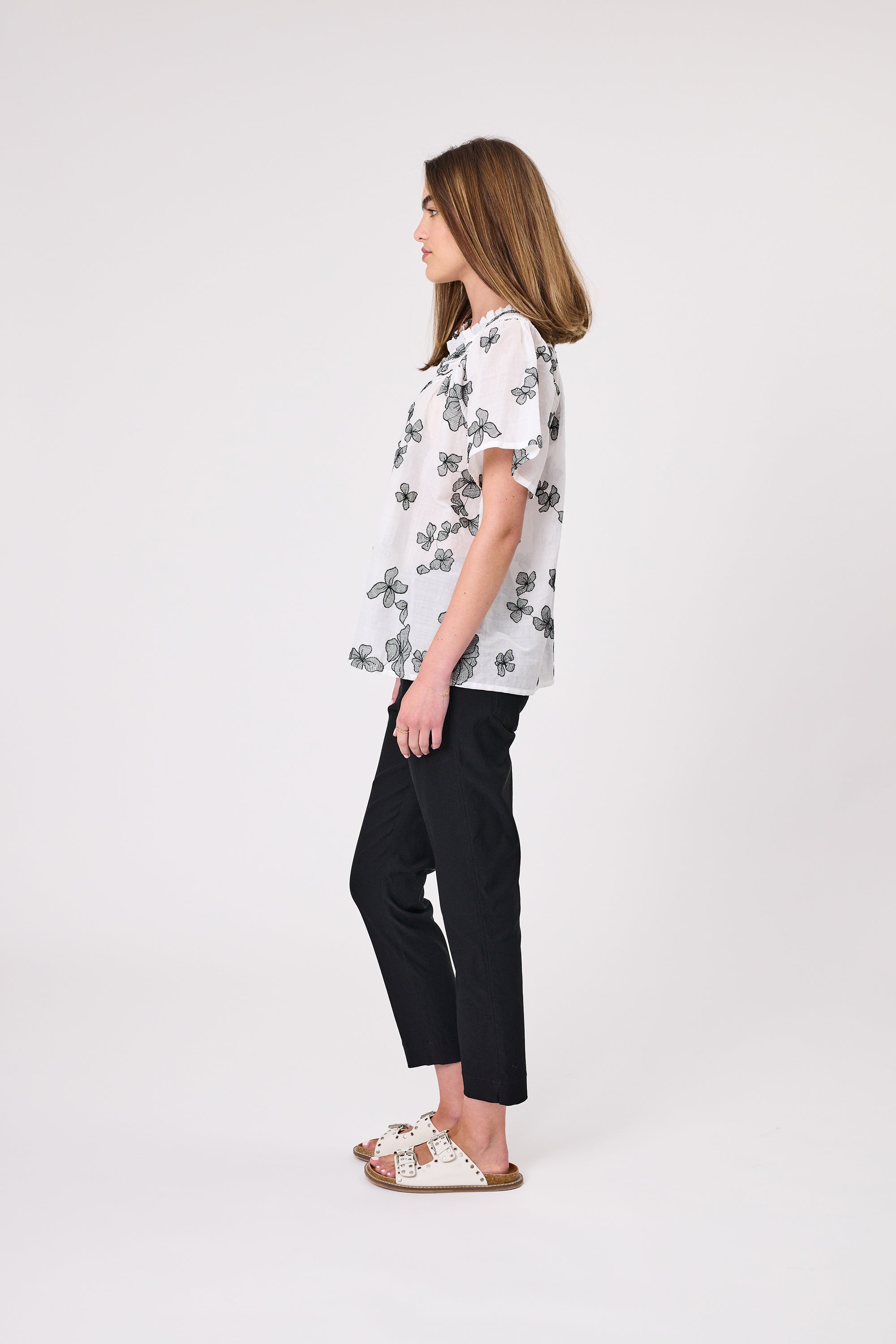 The Riddle Top features an allover embroidery. It is raglan short sleeves. Ruffles at neckline and lace trim around top front and back.