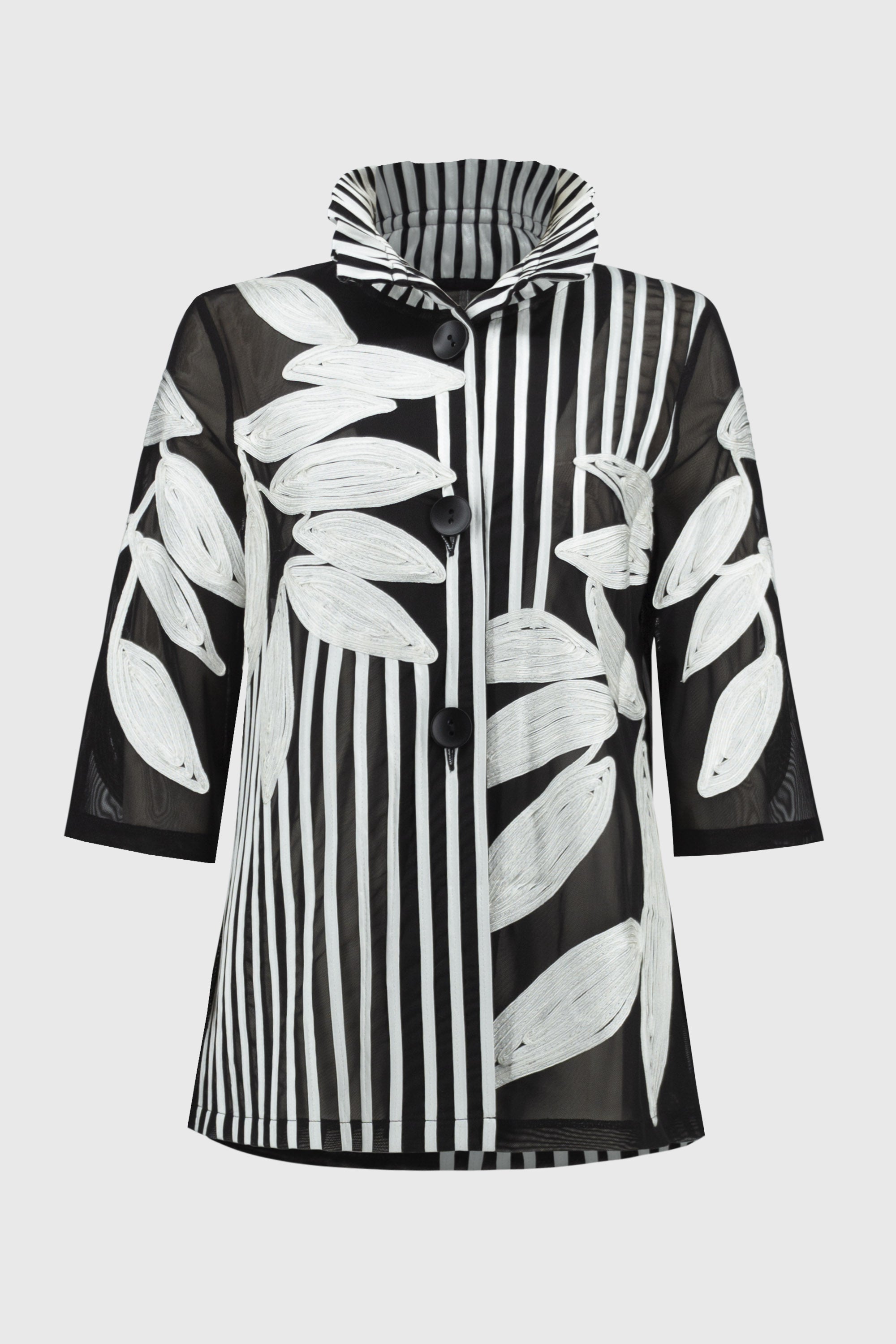A visual wonder, this stunning jacket offers a signature style with everyday functionality. Crafted from a stunning satin & mesh fabric that's texturally sophisticated, and framed by three-quarter bell sleeves and a mock collar, this top layer is in a class of its own.