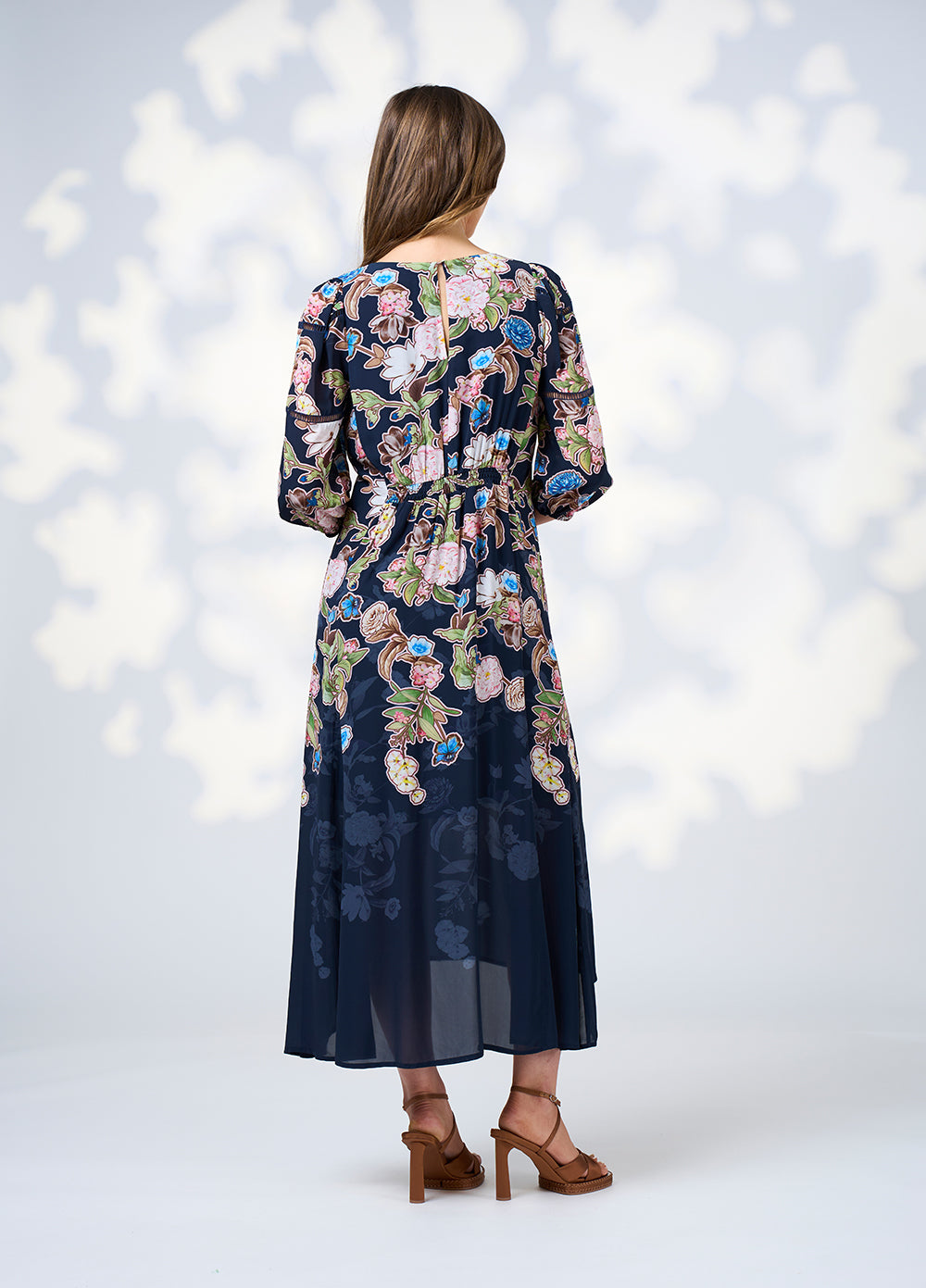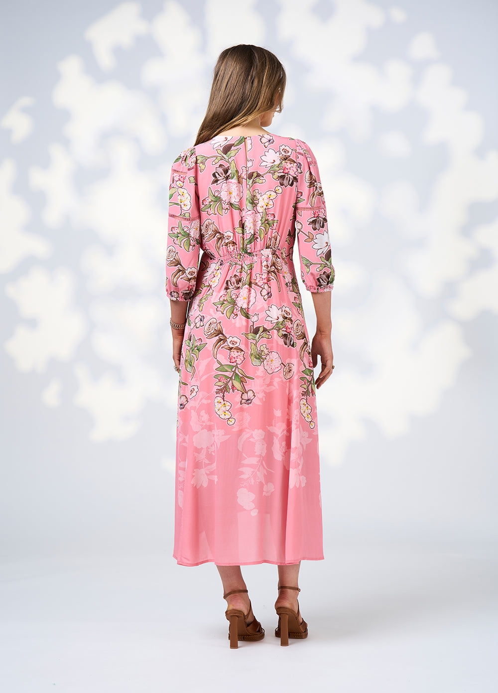 Printed midi dress with a V neckline with princess panels, and splits at front seams. Featuring inserted lace ladder trim on sleeves and shirring detail under bust and back waist, with elasticated cuffs. Fully Lined.