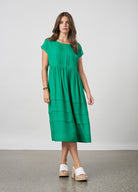 Lightweight dress with a gathered skirt at waist seam and bust darts for a flattering fit. Featuring vertical tucks on the bodice and horizontal tucks on the skirt to add detail. Lined.