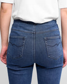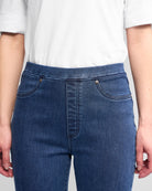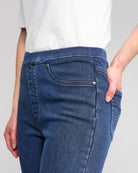 Full-length slim pant in stretch denim with a softly brushed inner for added warmth and comfort. Designed as an effortless pull-on style with an elasticated waistband, this pant creates a smooth, flattering fit and features refined denim-inspired details including a faux fly, faux front pockets, and back patch pockets.