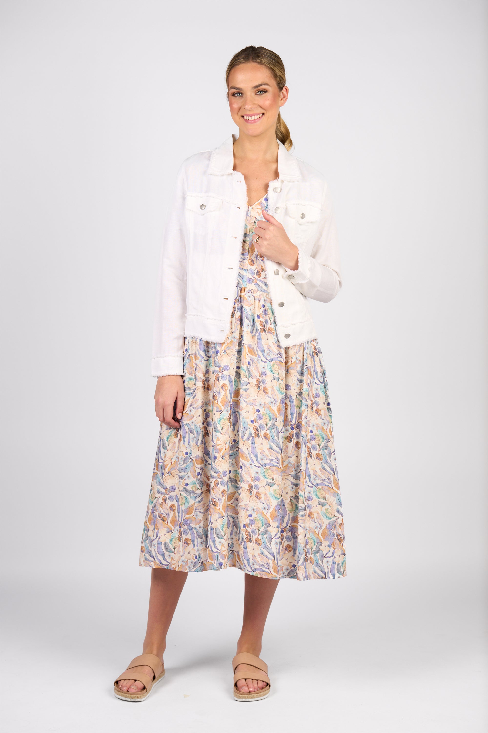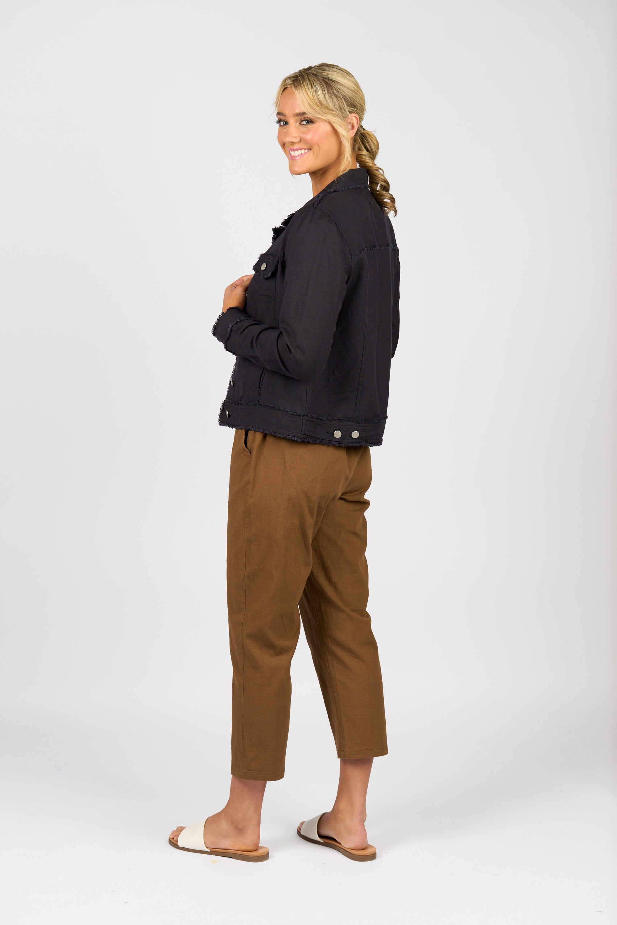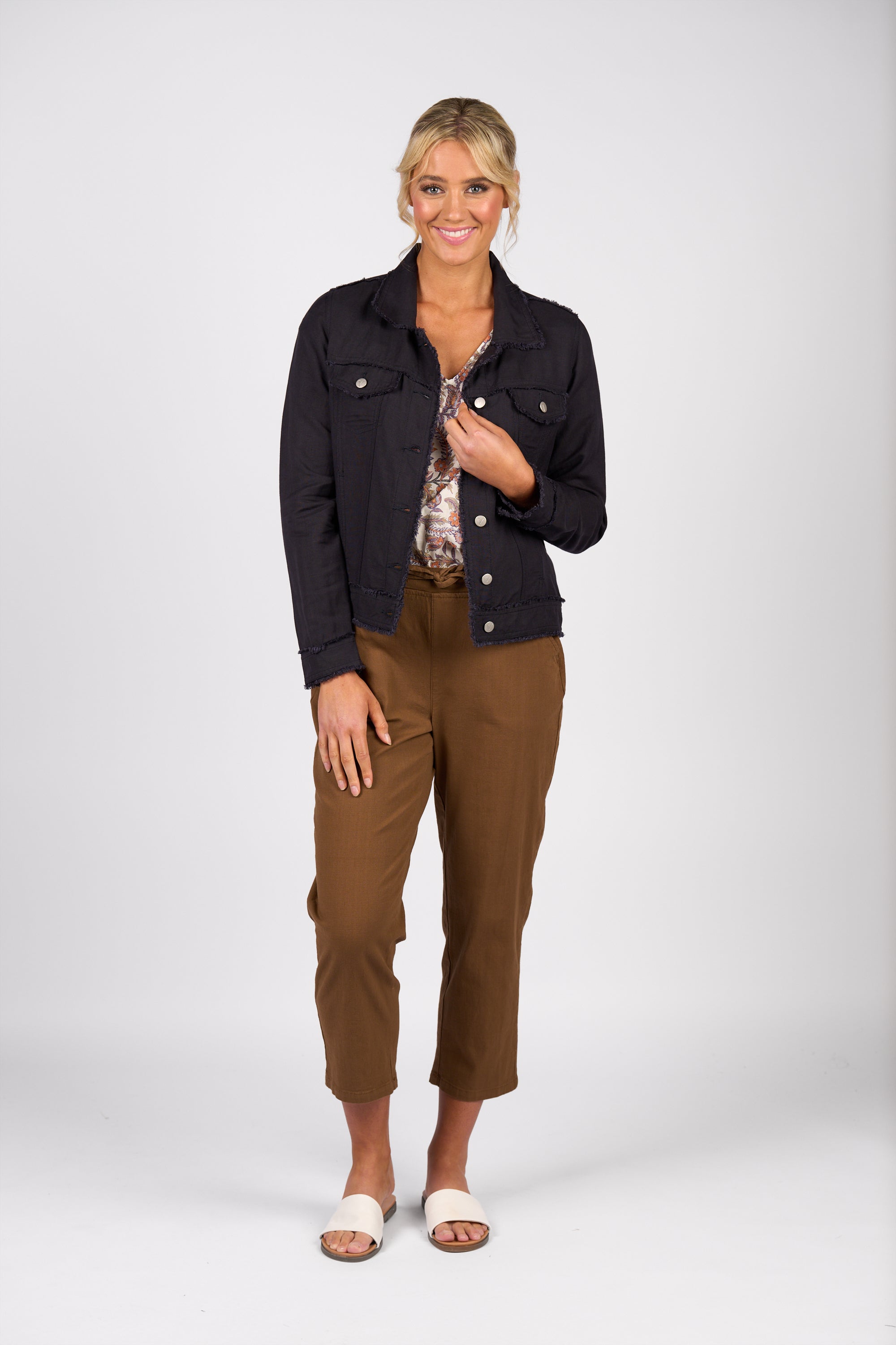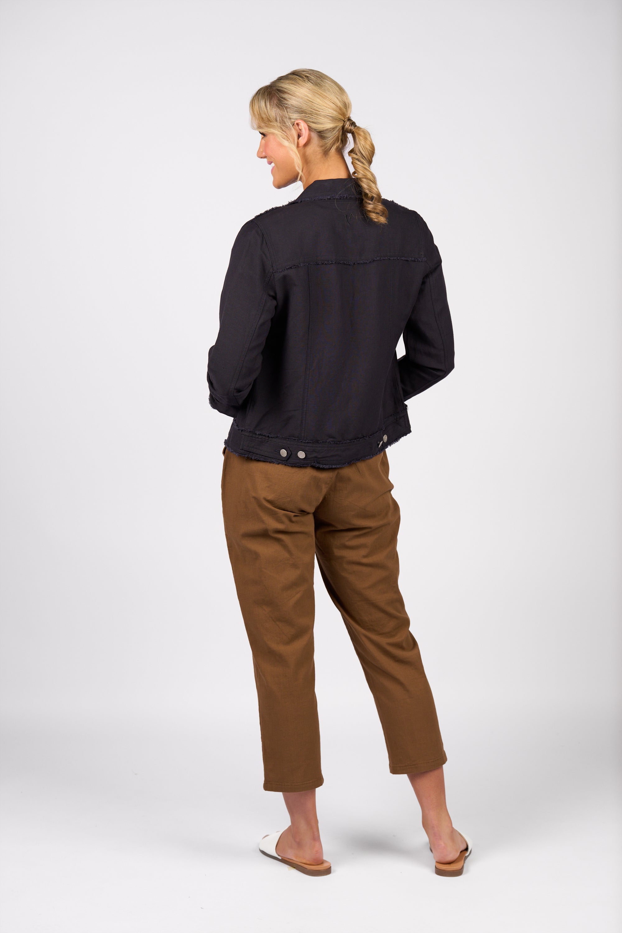 This button-up jacket is made from a linen-viscose blend and features frayed seam detailing for a textured look. Designed in a classic denim jacket shape with metal jean buttons and a relaxed fit, it’s an easy layering piece for everyday style.